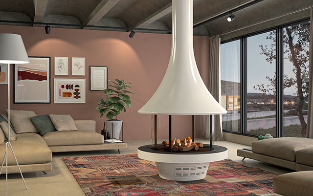 cheminées centrales, véritables sculptures au cœur de la pièce,