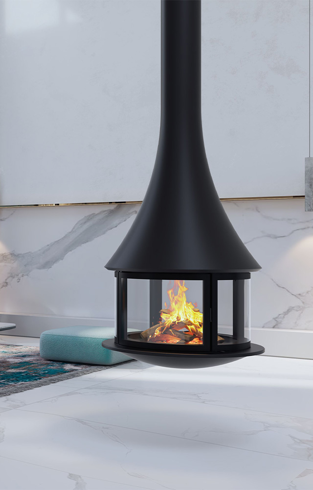 La cheminée suspendue apporte immédiatement un effet « waouh » à l’espace. Très design et spectaculaire, elle transforme l’intérieur avec audace et légèreté. Allumée comme éteinte, elle attire le regard et interpelle.